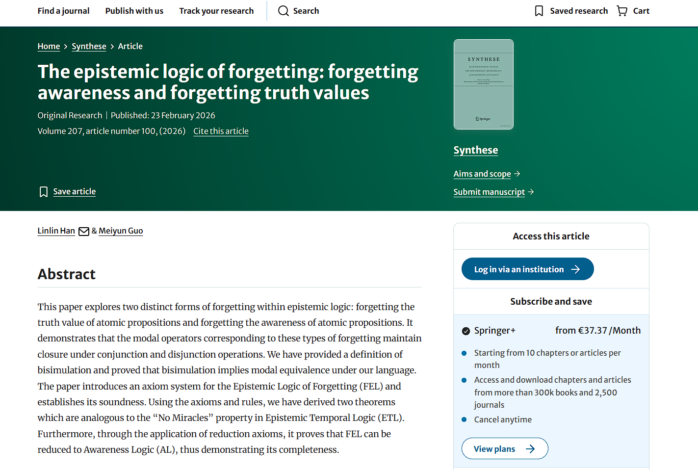 喜讯 | 中心郭美云教授、博士生韩琳琳共同新作在SYNTHESE上发表