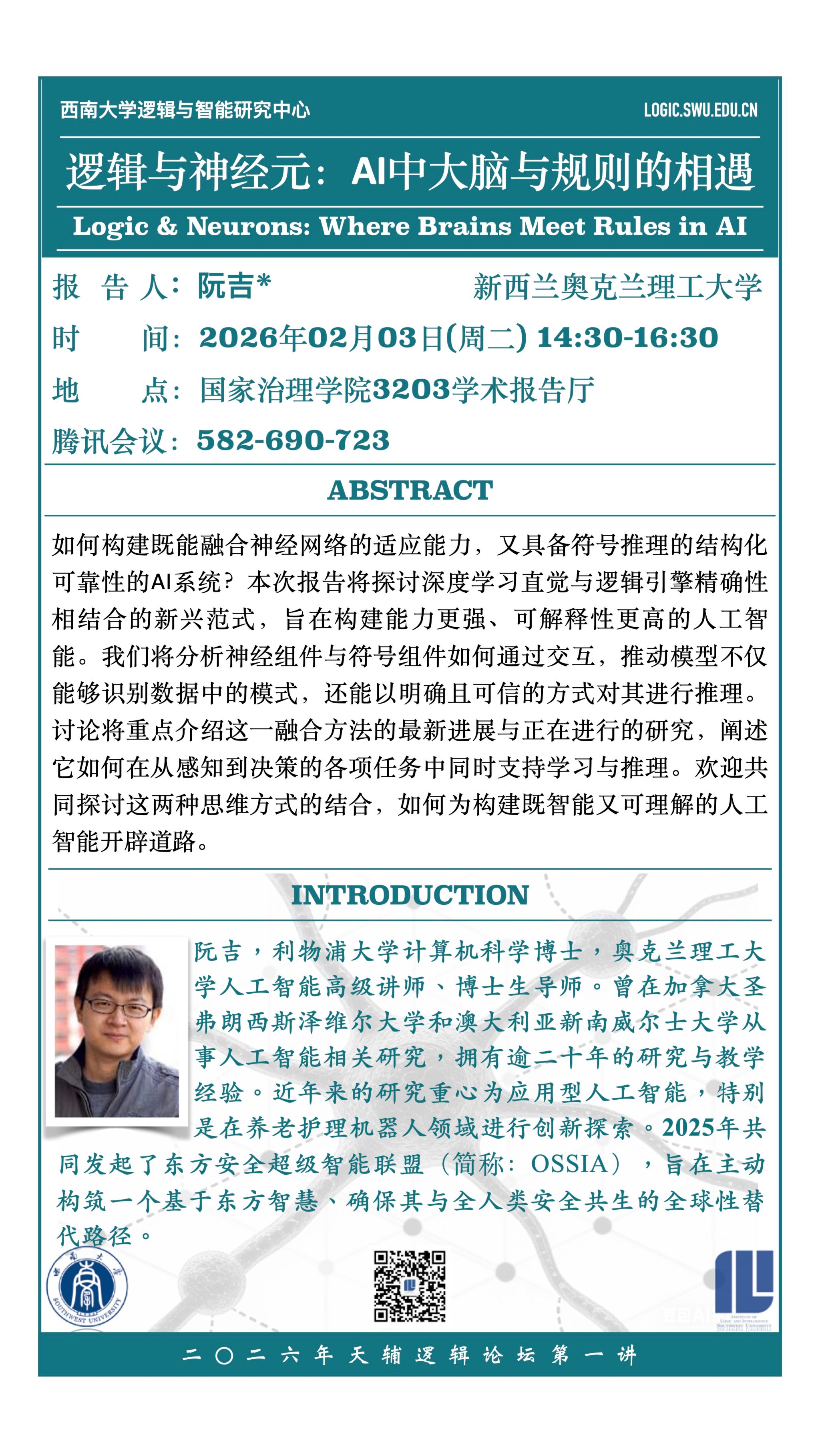报告人简介:阮吉,北京大学哲学学士、阿姆斯特丹大学逻辑学硕士、利物浦大学计算机科学博士,奥克兰理工大学人工智能高级讲师、博士生导师。其早期工作主要侧重于知识表示与推理、多智能体系统及博弈论等基础方向。曾在加拿大圣弗朗西斯泽维尔大学和澳大利亚新南威尔士大学从事人工智能相关研究,拥有逾二十年的研究与教学经验。近年来的研究重心为应用型人工智能,特别是在养老护理机器人领域进行创新探索。2025年共同发起了东方安全超级智能联盟(Oriental Safe Super-Intelligence Alliance,OSSIA),旨在主动构筑一个基于东方智慧、确保其与全人类安全共生的全球性替代路径。更多见:https://academics.aut.ac.nz/ji.ruan