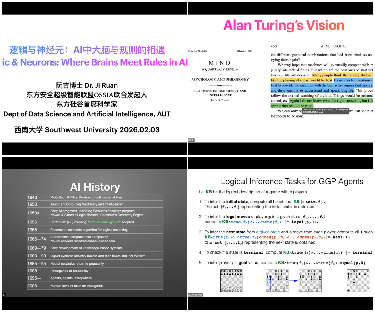 2026年2月3日,应中心主任郭美云教授邀请,新西兰奥克兰理工大学高级讲师阮吉博士做客“天辅逻辑论坛”,作题为“逻辑与神经元:AI中大脑与规则的相遇”的学术报告。报告由郭美云教授主持,吸引了中心师生及国内外高校学者(线上线下)共70余人参加。